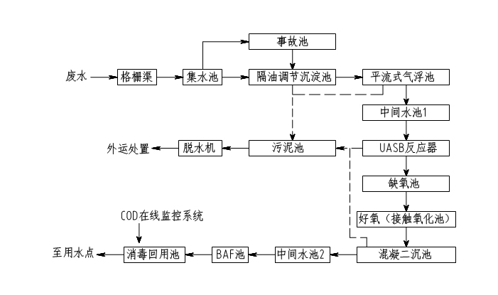 经过严格工艺比选,我司选用“气浮+UASB+AAO+BAF”的主题工艺,其中好氧段选用接触氧化工艺。工艺路线如下: